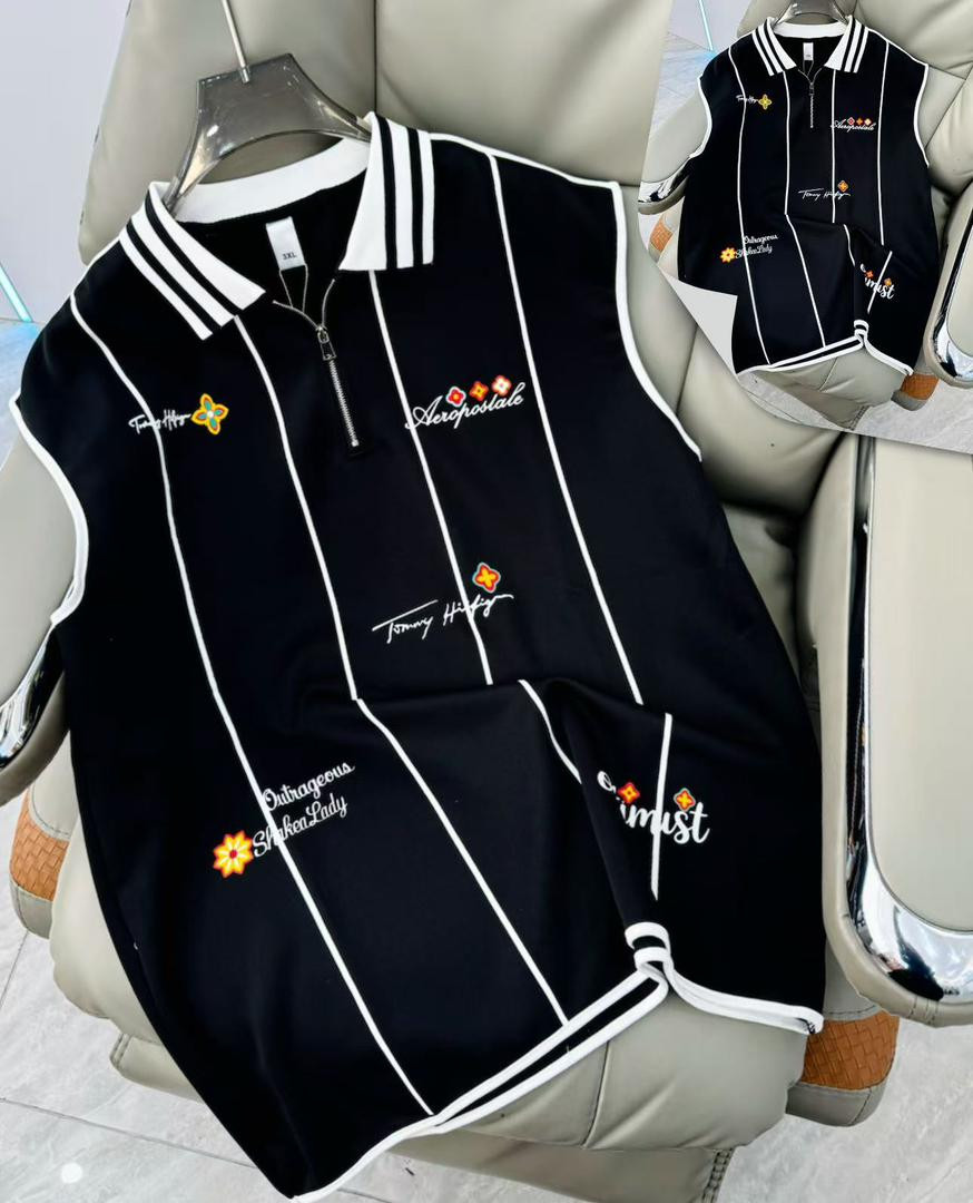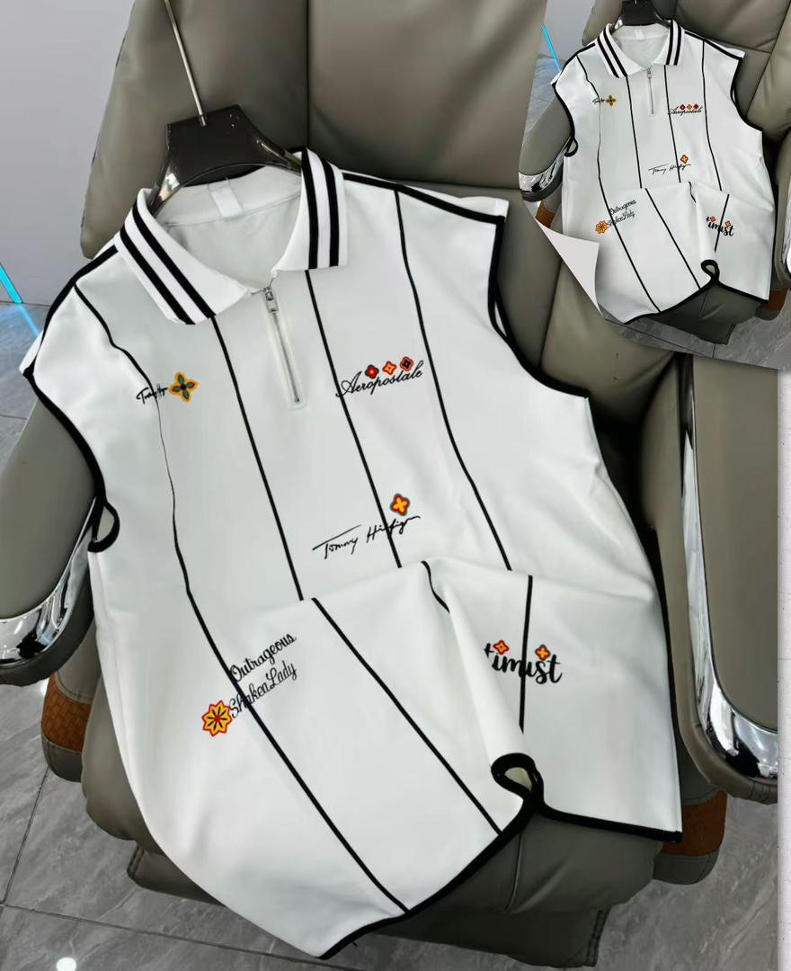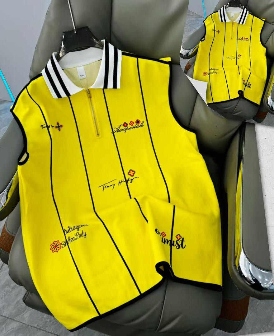Stand out loud in this bright yellow sleeveless polo vest – a maximalist Tommy Hilfiger/Aeropostale-inspired piece loaded with scattered embroidery for ultimate hype energy! The vibrant canary yellow base contrasts with the light blue collar and black/white striped trim (classic preppy-sporty pop), while scattered black cursive script (Tommy Hilfiger, Aeropostale, Outrageous, ShikenLady, imust, Tommy Harty) mixed with small red/orange flower/cross/star motifs adds chaotic custom streetwear flair. Half-zip placket, oversized boxy fit, dropped armholes, longer length, ribbed cuffs/collar, and side slits make it ultra-comfortable and versatile—perfect for Plumstead layering over tees/hoodies or solo with joggers/cargos/sneakers for bold party or preppy-street looks in mild February weather.