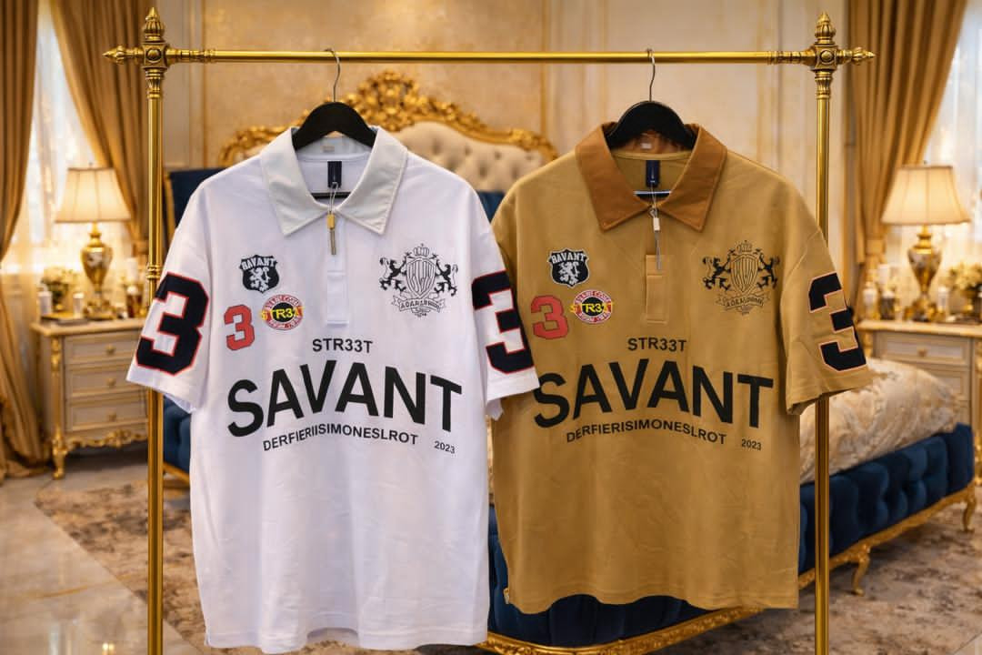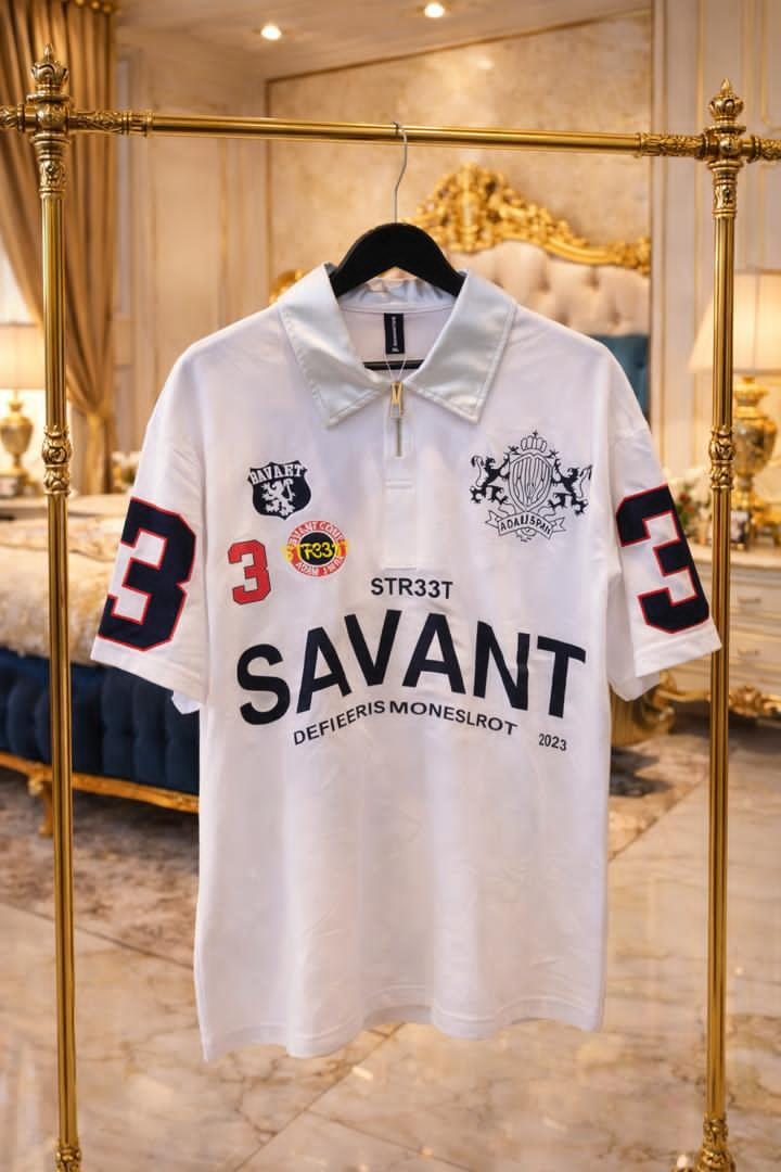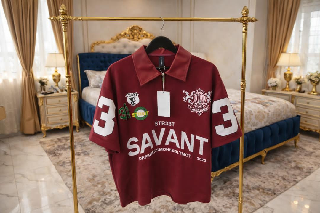 Drop heat with this STR33T SAVANT polo – Lagos streetwear royalty in maroon with heavy patches and bold graphics!
