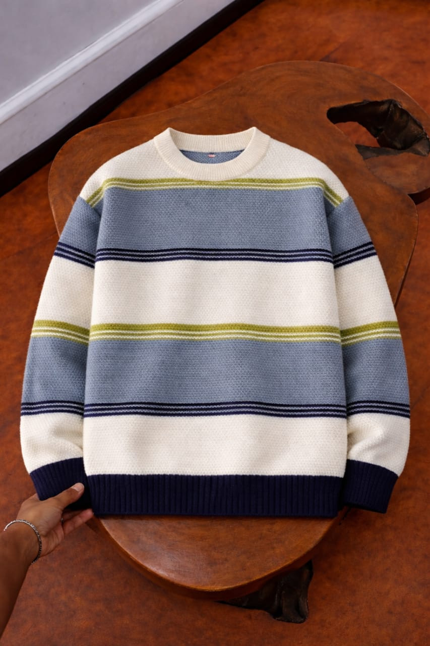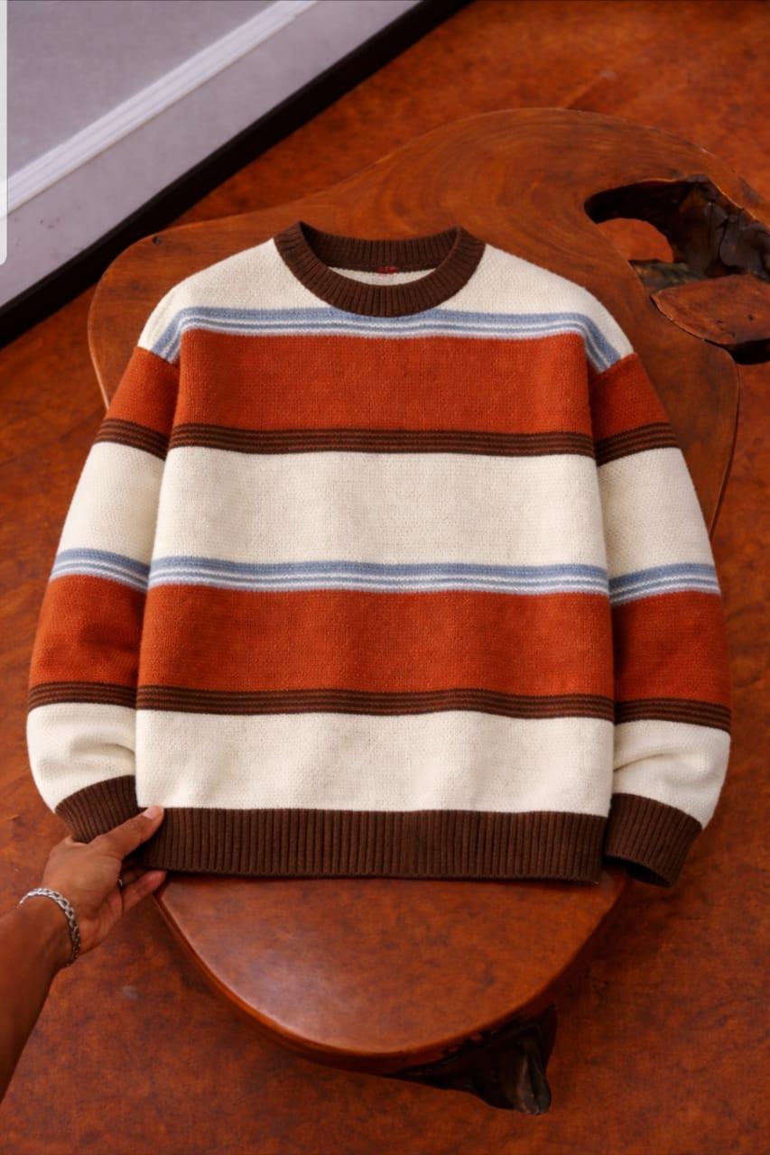 Cozy up in style with this ? oversized striped crewneck sweater! Bold horizontal stripes in teal, beige/brown, and cream with thin white accents on a textured ribbed knit – retro-preppy vibes meet modern comfort.