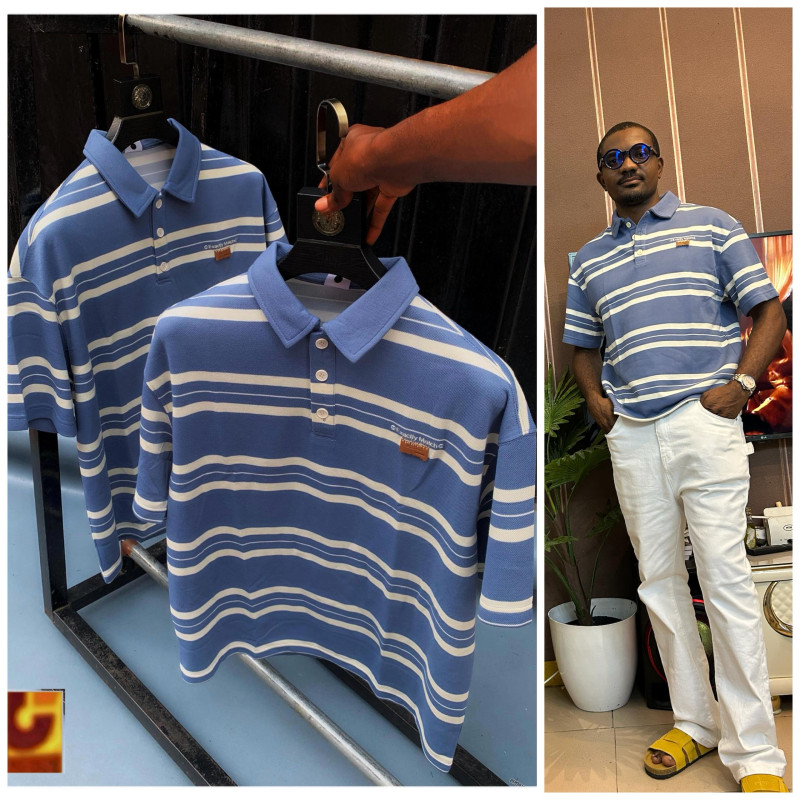 Subtle luxury patch + wavy stripes for effortless Lagos drip.