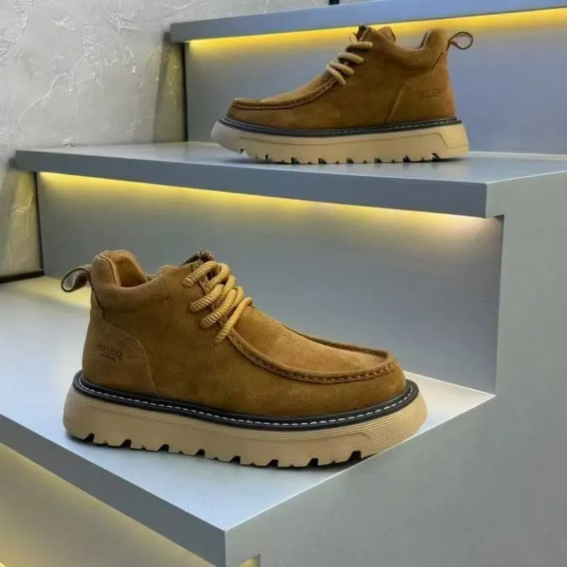 Rugged style meets comfort in these ? tan suede chunky ankle boots! Soft suede upper in warm tan with moc-toe stitching, yellow rope laces, and thick lug platform sole – bold streetwear vibe perfect for Lagos outfits.