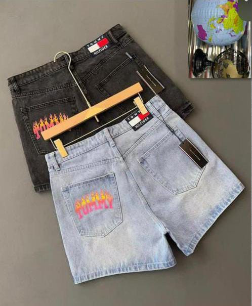 Heavy Lagos street flex with these Tommy-inspired flame pocket denim shorts – oversized wash + bright flame embroidery on back pockets for hype drip!