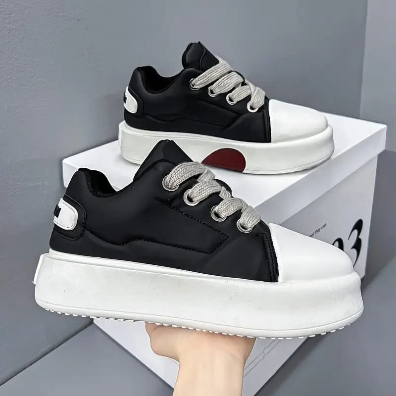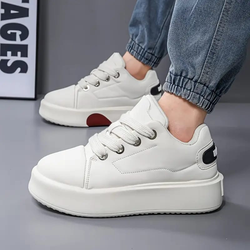 Step up your game with these white chunky platform sneakers – thick soles, bold height, and effortless streetwear vibe! The glossy white PU leather upper delivers a clean, premium look with subtle black side tab detail, while the exaggerated thick white rubber platform sole (4–6 cm lift) adds instant drama and comfort. White flat laces, perforated toe box for breathability, padded collar/tongue, metal eyelets, and grippy rubber outsole make them ultra-comfortable and durable—perfect for Plumstead layering with jeans/joggers/oversized tees in February chill or pairing with dresses/skirts/sneaker outfits for Y2K revival, hype fashion, casual chic, or everyday streetwear flex.