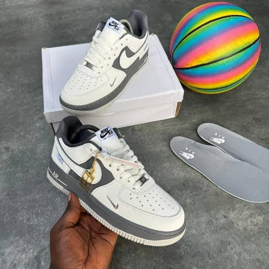 Hype luxury energy in these ? white/gray Off-White-inspired AF1 customs! Leather upper with blue "AIR" print, grey Swoosh/heel, gold chain tag, and chunky sole – ultimate street flex for Lagos outfits.