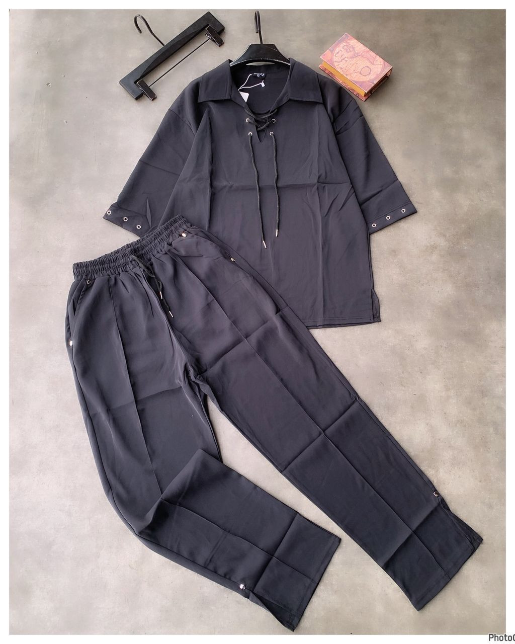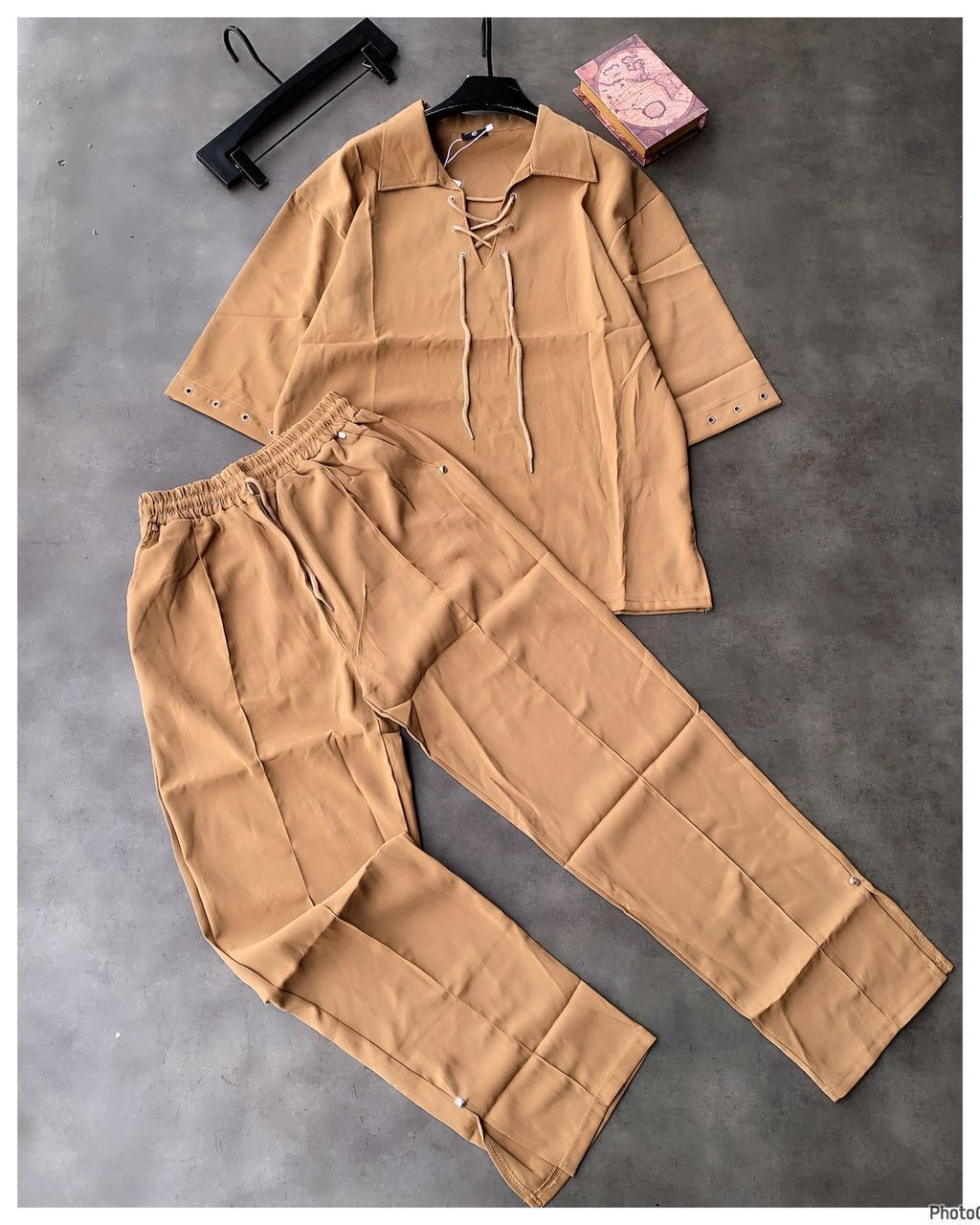 Elastic/drawstring waist pants with wide-leg silhouette, straight or slightly tapered hem (possible small vents/slits for flow), and relaxed through hips/thighs