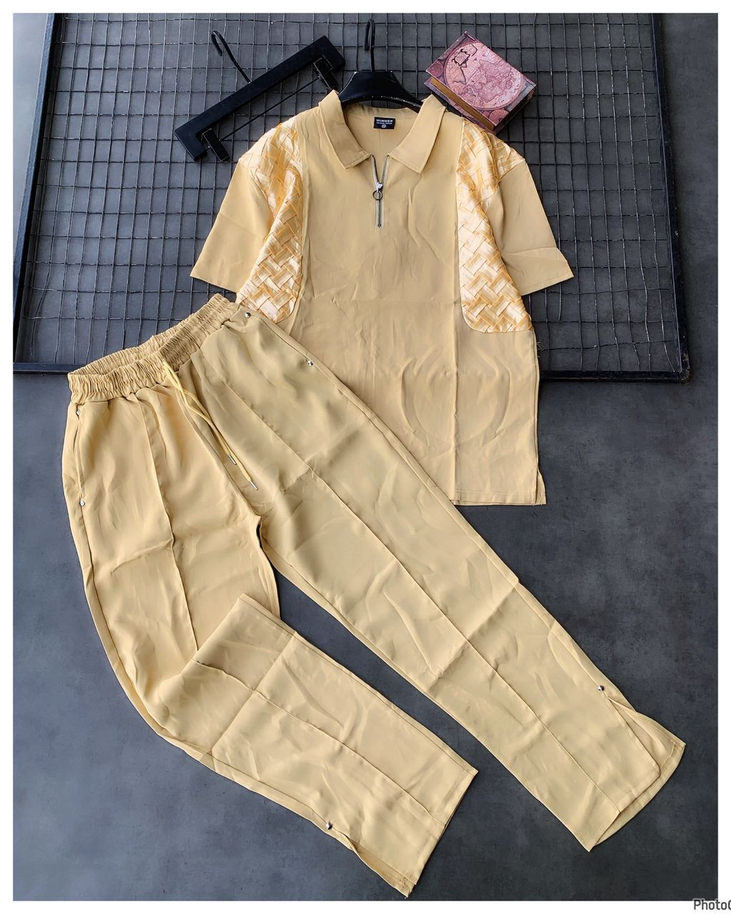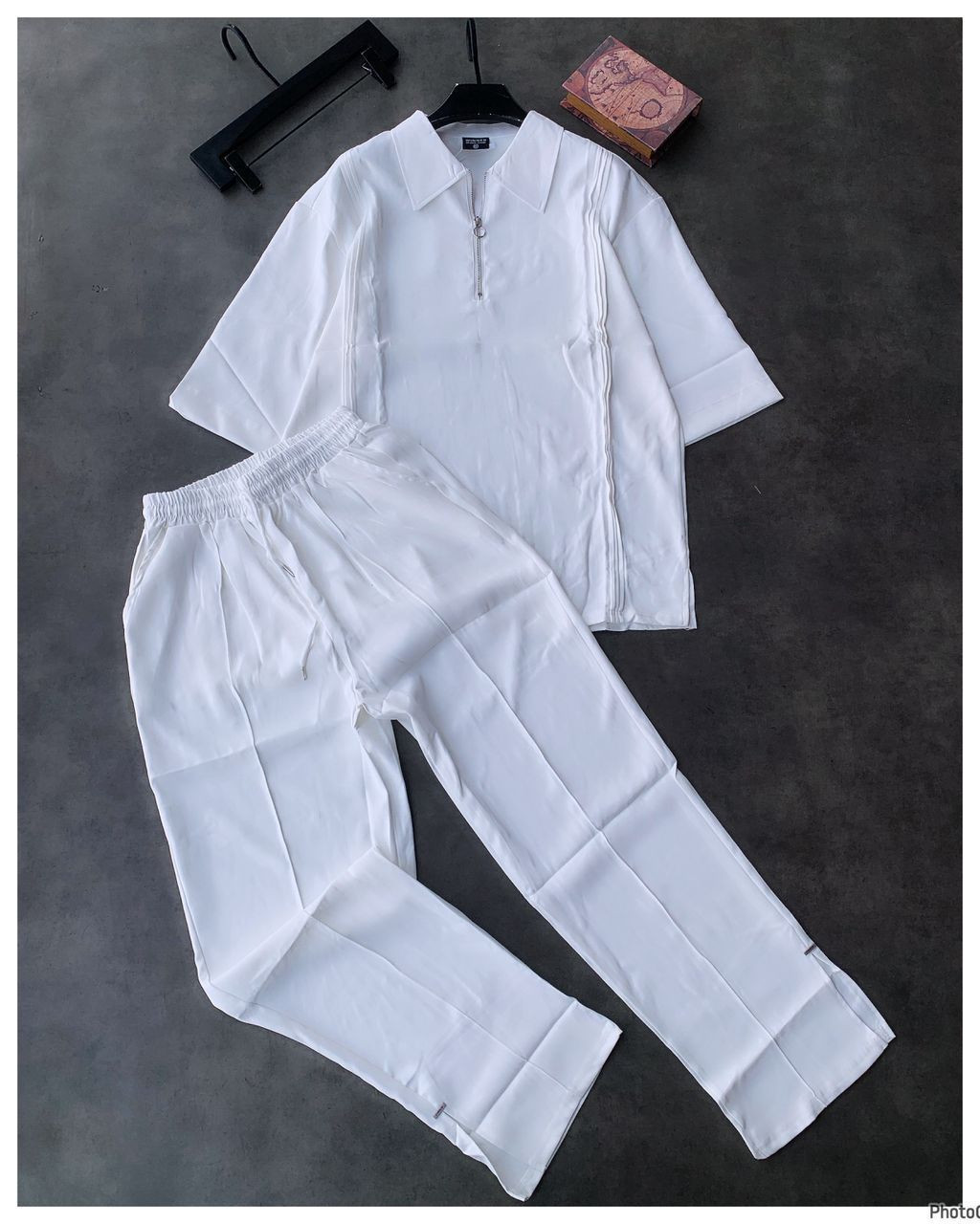 Elevate your everyday with this sleek 2-piece white co-ord set – featuring a quarter-zip polo shirt and matching wide-leg pants for that clean, minimalist streetwear vibe! The all-white monochromatic design with subtle vertical seams/piping adds architectural texture and a high-fashion edge, inspired by premium techwear and quiet luxury looks. Perfect for transitional weather – layer under jackets in February chills or wear solo for effortless cool.