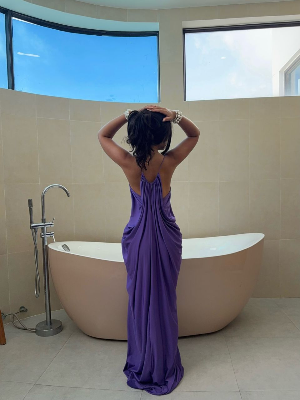 Turn heads in this stunning Women's Purple Halter Neck Maxi Dress. Featuring a beautiful draped design, this elegant sleeveless gown is perfect for summer evenings, beach vacations, weddings, parties, or any special occasion.